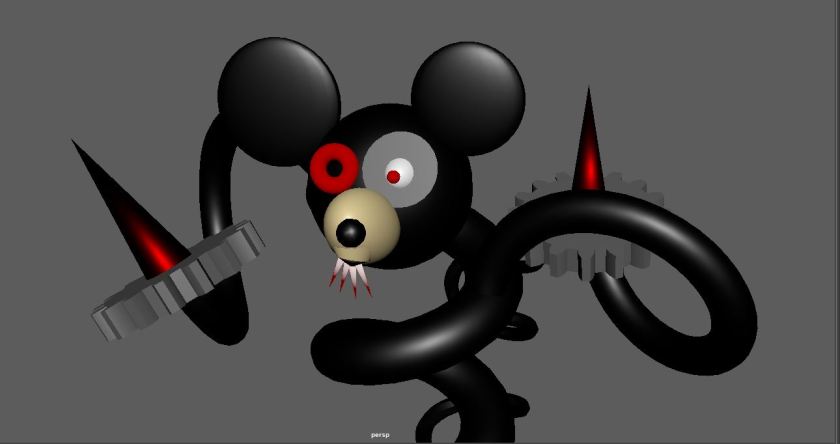 Task: Create an abstract Mickey Mouse by simple geometric shapes. You need to use minimum 5 Primitive Objects available in Maya. Apply a material which suits to the character.